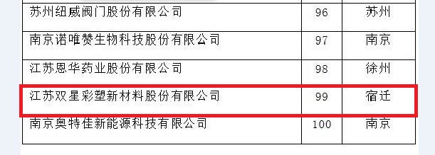 On October 26, the "2021 Sukeqing Innovation Forum" was held in Suzhou. During the forum, Jiangsu Provincial Institute of Science and Technology Development Strategy and Jiangsu Provincial Institute of Science and Technology Information released the list of "2021 Top 100 Innovative Enterprises in Jiangsu Province", and Jiangsu Double Star Color Plastic New Materials Co., Ltd. was included in the list.
