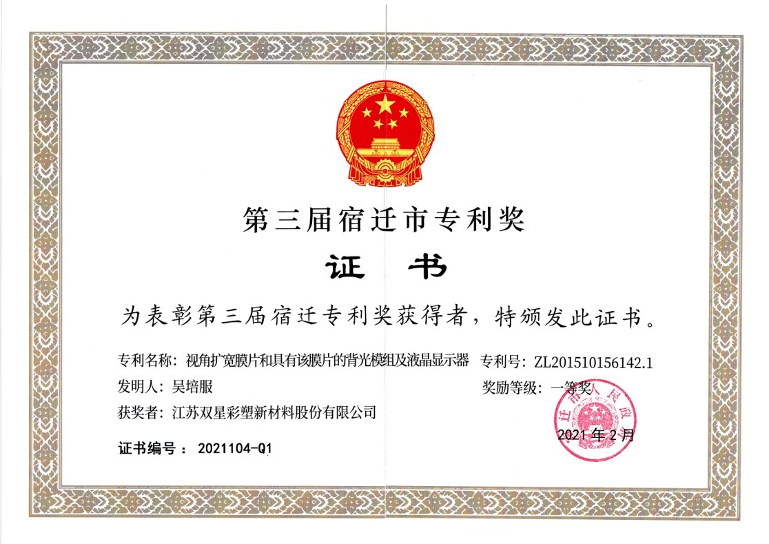 2021年5月7日,全市加快工業經濟高質量發展暨招商引資大會上,表彰了第三屆宿遷市專利獎獲獎單位,公司申報的“視角擴寬膜片和具有該膜片的背光模組及液晶顯示器”專利項目榮獲一等獎。