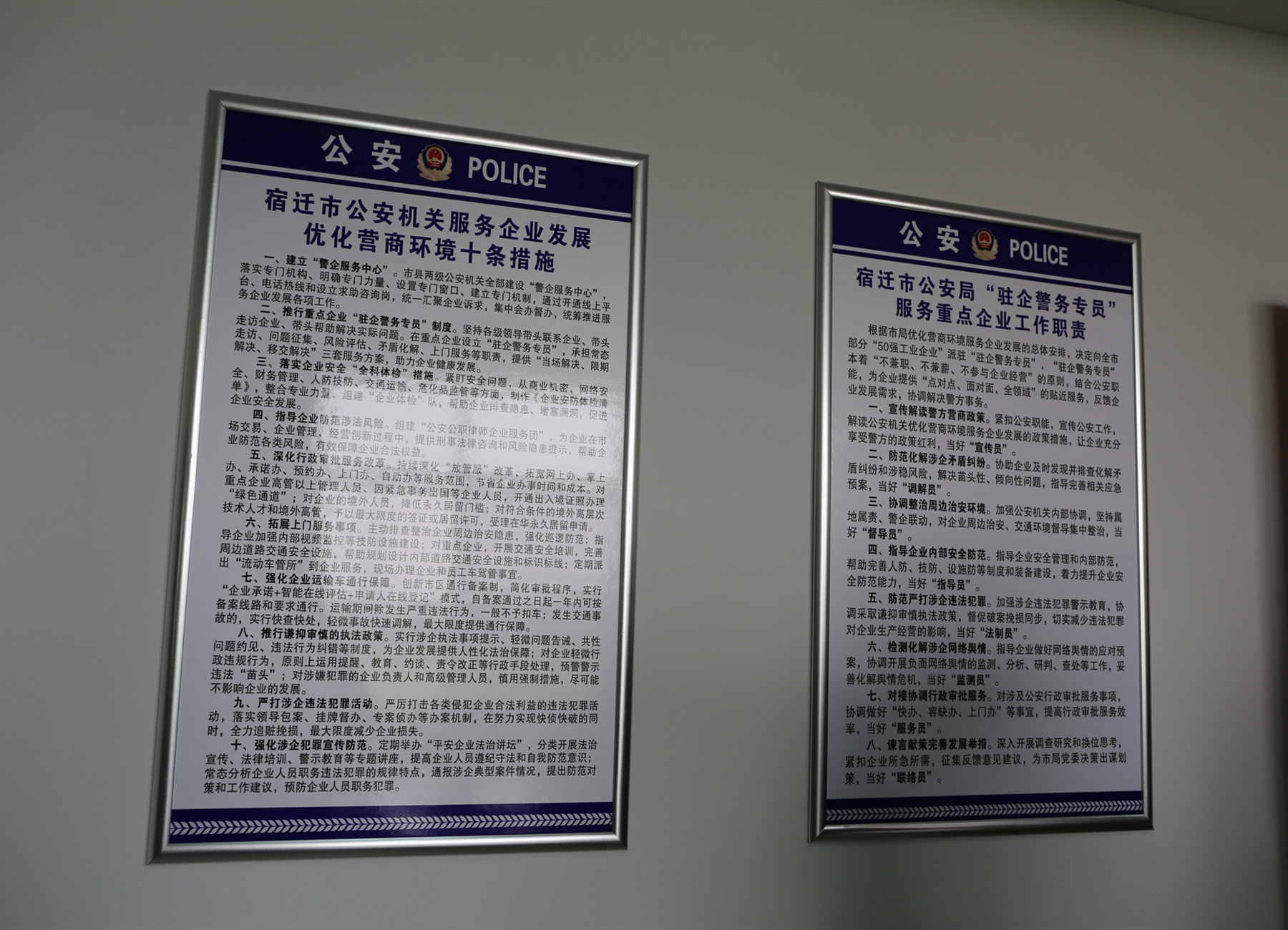 據了解首批派駐“駐企警務專員”的除江蘇雙星彩塑新材料股份有限公司外還有洋河酒廠、箭鹿集團、恒力化工等10家宿遷重點工業企業。駐企警務專員將對企業提供“點對點、面對面”的“全方位、全流程”服務,全力為企業提供安全有序的生產環境、公平正義的法治環境和優質高效的服務環境。