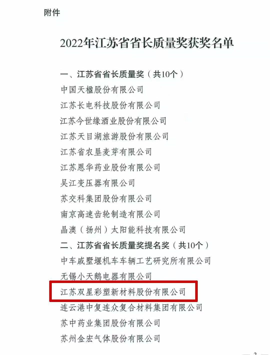 日前《省政府關于授予2022年江蘇省省長質量獎的決定》(蘇政發〔2022〕84號)正式印發,江蘇雙星彩塑新材料股份有限公司榮獲江蘇省省長質量獎提名獎,成為宿遷市獨家獲此殊榮的企業。