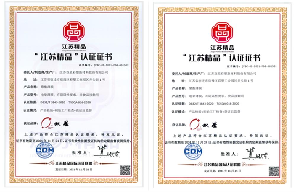 近日公司收到“江蘇精品”國際認證聯盟發來的“江蘇精品”認證證書,雙星新材的兩款電暈聚脂薄膜產品被正式認定為“江蘇精品”,從而標志著雙星新材率先躋身“江蘇精品”的優質制造業品牌之一。