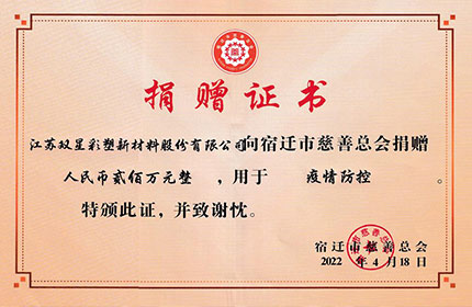 2022年2月18日,全市加快工業經濟高質量發展暨招商引資大會上,公布了2021年度“宿遷市貢獻10強、投資10強、銷售10強”工業企業名單,雙星新材喜獲“貢獻10強位列第5名、投資10強位列第4名、銷售10強位列第7名”。
